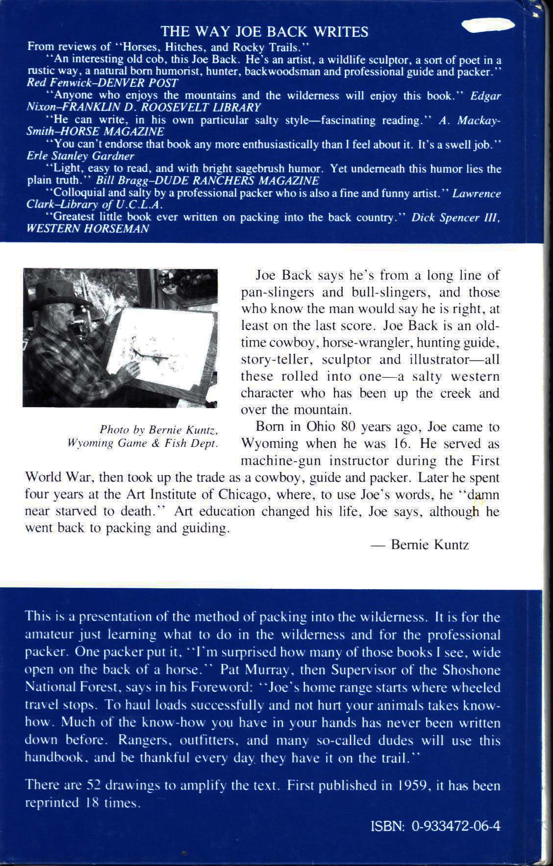 At times backpackers will ride into the wilderness, then hike out with a pack that continues to get lighter. Or one can be horse-packed into a base camp and picked up when it is time to leave. For such trips this book will give an understanding of both the opportunities and limits of using horses in the wilderness and assist your packer in giving you the best experience. For persons doing their own horse-packing this presentation gives insights for beginners and tips perhaps unknown to even those with experience. For rangers, outfitters, and so-called dudes to use for the trail. 52 drawings of gear and hitches and scenes, appendix of food and equipment list, 118 pages. A classic in its 18th printing since 1959.